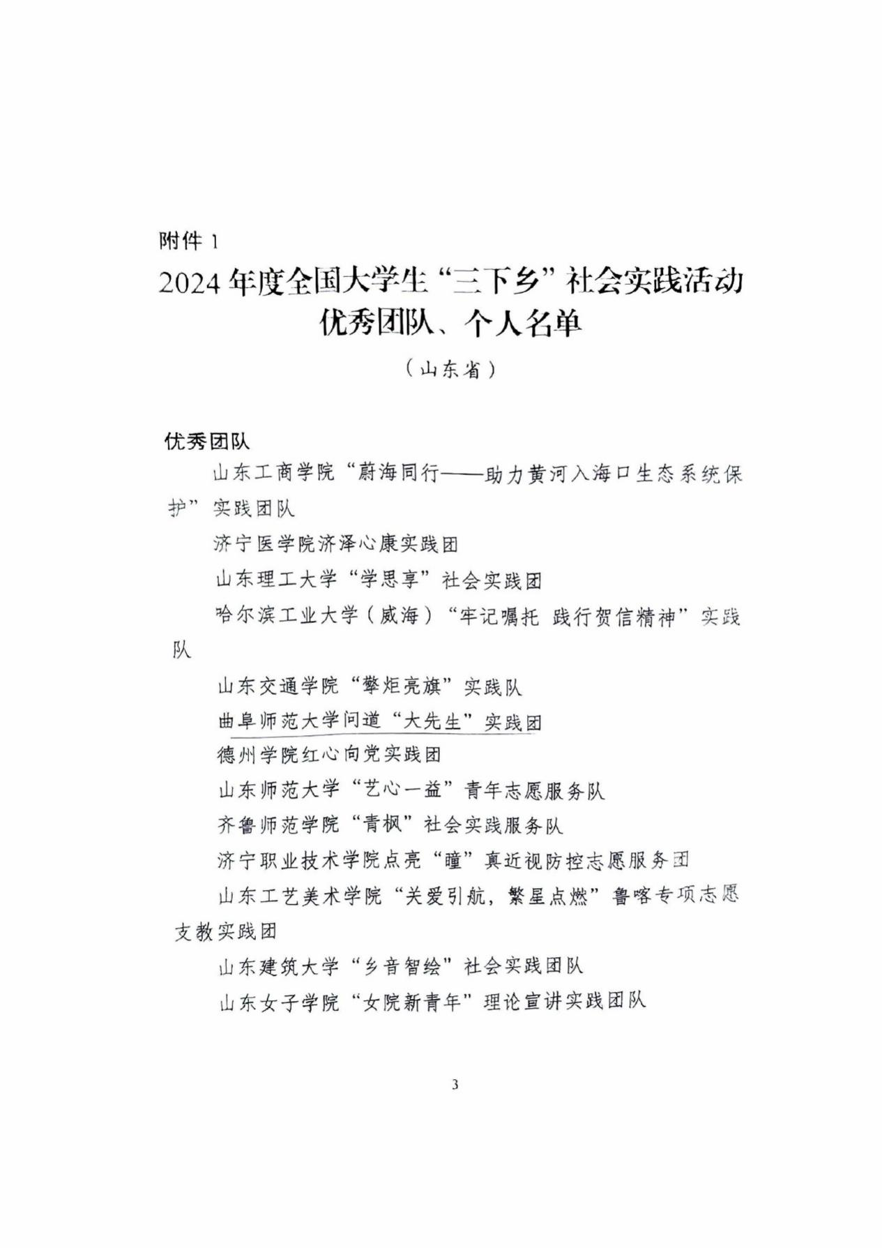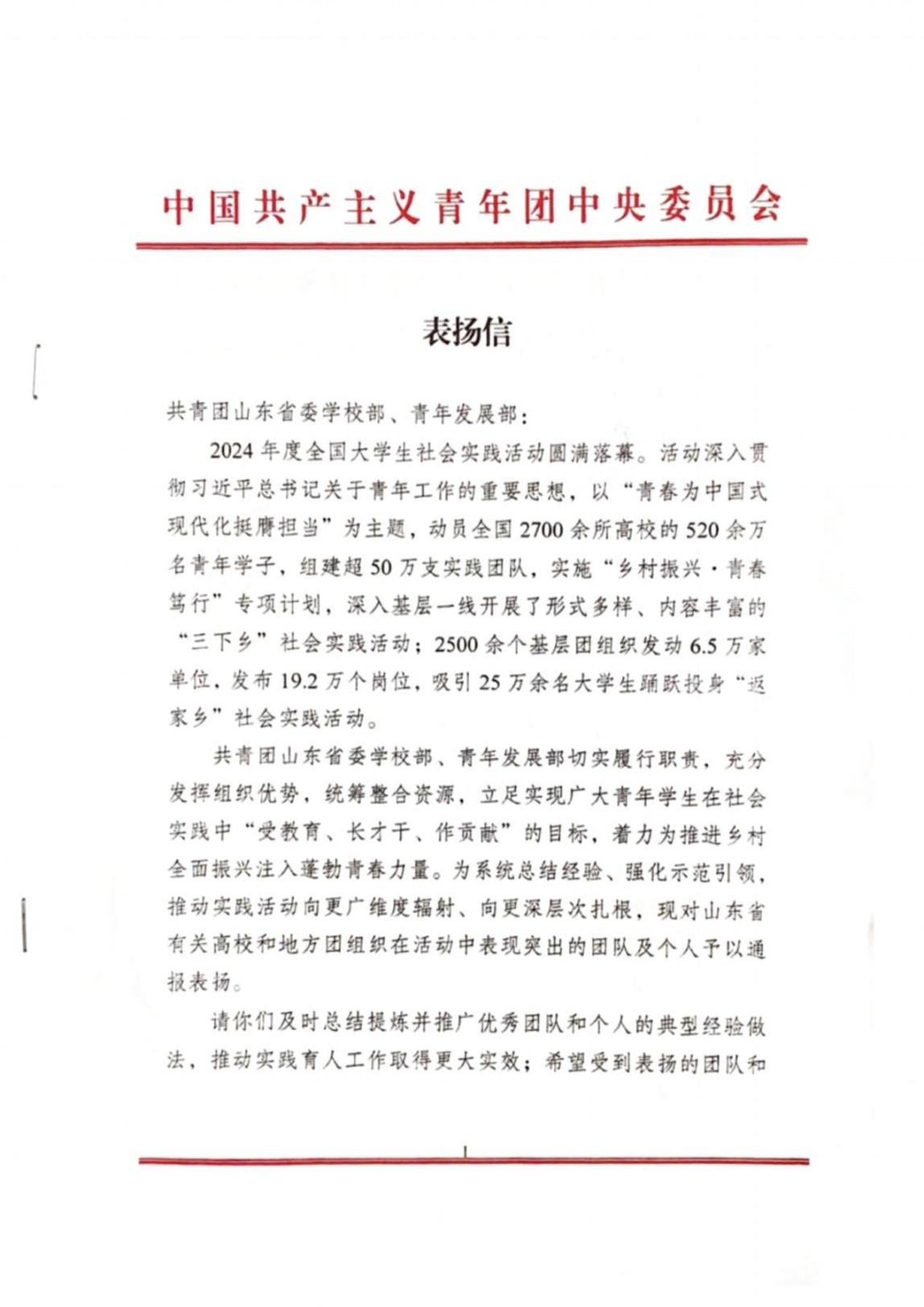4月21日,共青团中央青年发展部向曲阜师范大学发来表扬信,对问道“大先生”实践团在全国大学生社会实践活动中的优异表现予以表彰。信中高度赞扬曲师学子为“大力弘扬教育家精神,加快建设教育强国”作出的积极贡献,并授予该团队“2024年全国大学生社会实践活动优秀团队”称号。